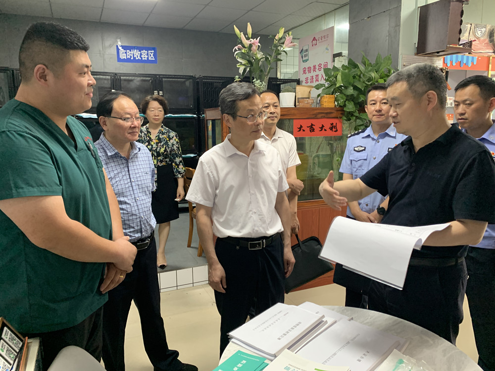 7月20日,安慶市人大常委會(huì)副主任程志翔率隊(duì)來桐督導(dǎo)檢查“文明養(yǎng)犬”工作。桐城市人大常委會(huì)副主任程赟、副市長金天柱陪同檢查。