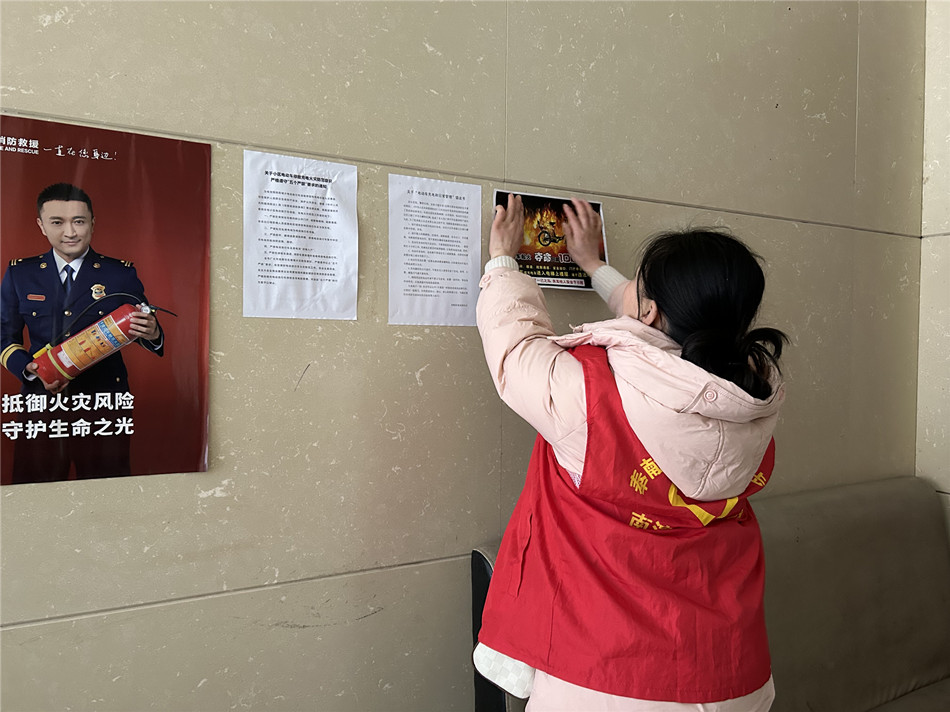 活動中,志愿者們在小區(qū)宣傳欄、樓道、電梯間等醒目位置張貼宣傳海報,發(fā)放《關(guān)于電動車充電和日常管理倡議書》,提醒居民嚴禁占用樓道或消防通道停放電動車及充電、嚴禁飛線充電等危險行為,要求居民做到規(guī)范停車、安全充電,共護小區(qū)消防安全;對已經(jīng)停放在樓道的電動車,志愿者們合力將其轉(zhuǎn)移至安全區(qū)域,消除安全隱患,維護公共安全。