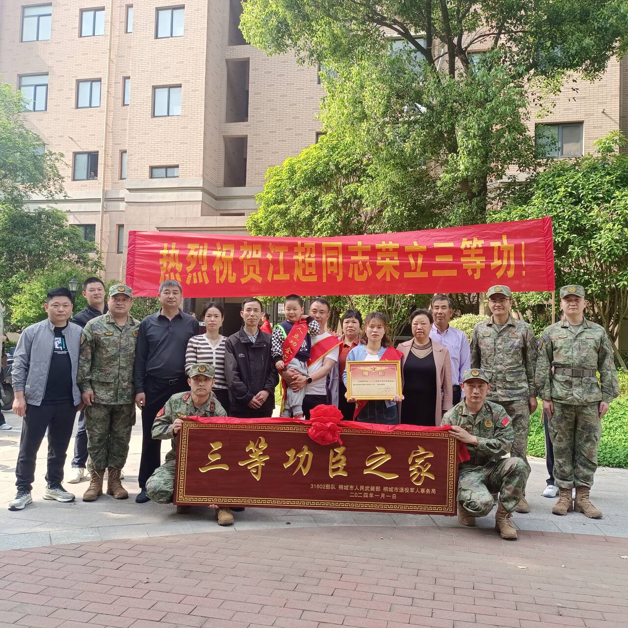 4月25日,陸軍某部領(lǐng)導(dǎo)、市人武部及市退役事務(wù)局相關(guān)負(fù)責(zé)同志一行專程前往龍騰街道望城村,為榮立三等功的現(xiàn)役軍人江超及其親屬送上立功喜報。
