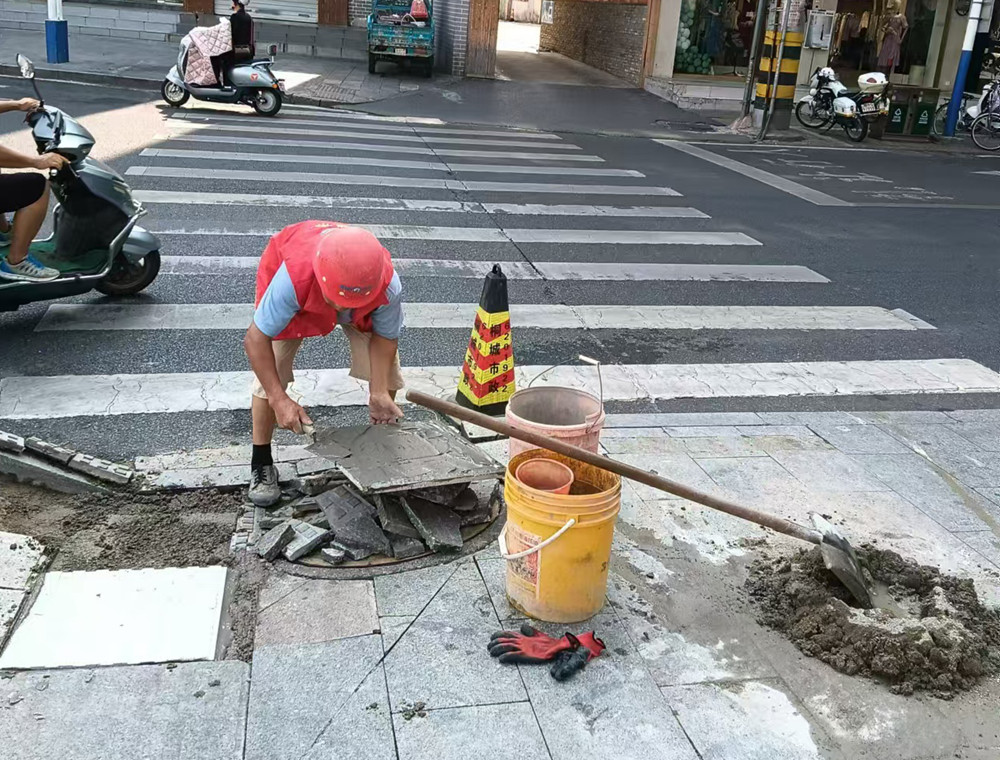 在人行道修復(fù)中,施工人員嚴格按照修復(fù)方案,清除破損地磚、清理殘留殘屑,再重新用水泥將新地磚鋪上,確保鋪設(shè)的地磚與原人行道地磚規(guī)格一致、風格一致。