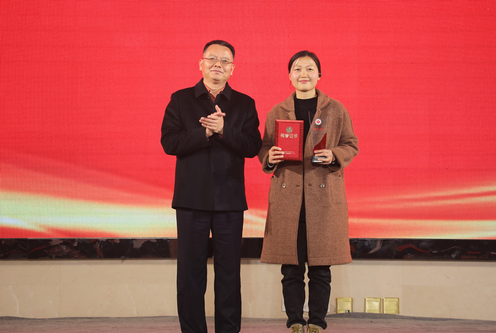 圖為安慶市民政局局長、安慶市慈善總會(huì)常務(wù)副會(huì)長蔡婷婷為獲獎(jiǎng)?wù)哳C獎(jiǎng)。