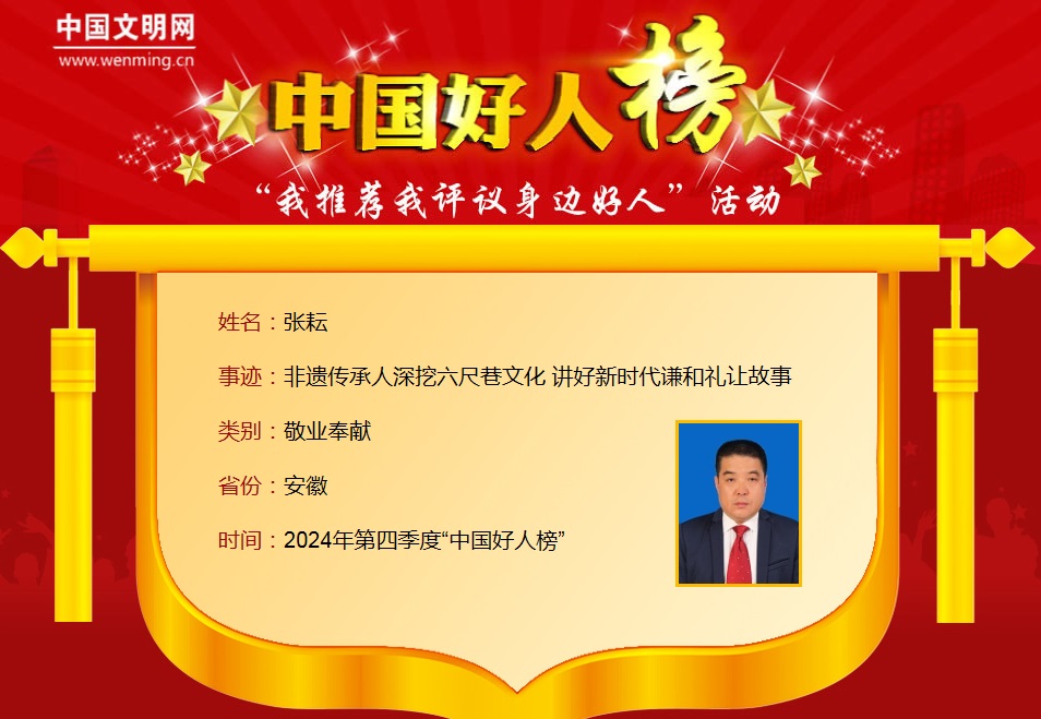 【人物簡(jiǎn)介】張?jiān),男?968年1月生,中共黨員,安徽省安慶市桐城市文昌街道六尺巷社區(qū)黨總支書記、社居委主任,非遺項(xiàng)目六尺巷傳說省級(jí)代表性傳承人。張?jiān)艑⒘呦锕适轮刑N(yùn)含的謙和禮讓精神應(yīng)用到實(shí)際工作中,創(chuàng)新性地運(yùn)用“六尺巷調(diào)解法”,組建“六尺巷故事”講解隊(duì),打造“德鄰社”文化活動(dòng)中心,身體力行做好六尺巷精神的傳承和推廣。