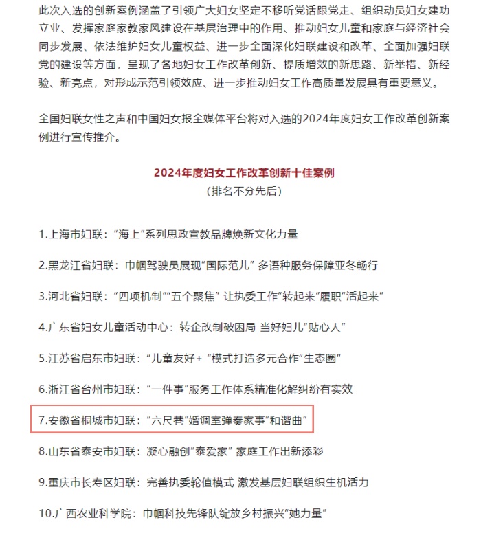 近日,由中國(guó)婦女報(bào)社(全國(guó)婦聯(lián)網(wǎng)絡(luò)信息傳播中心)主辦的2024年度婦女工作改革創(chuàng)新案例征集活動(dòng)結(jié)果正式發(fā)布。其中《安徽省桐城市婦聯(lián):“六尺巷”婚調(diào)室彈奏家事“和諧曲”》成功入選2024年度婦女工作改革創(chuàng)新“十佳”案例。 近年來,桐城市婦聯(lián)深入挖掘六尺巷的文化內(nèi)涵,將“和諧禮讓”精神融入婚姻家庭糾紛調(diào)解。2021年11月,經(jīng)過精心籌備,“六尺巷”婚調(diào)室依托各級(jí)“婦女之家”示范點(diǎn)掛牌成立。“婦女之家”擁有寬敞的場(chǎng)地、完備的設(shè)施以及豐富的人力資源和廣泛的群眾基礎(chǔ),為婚調(diào)室開展工作提供了便利條件;通過整合各方資源,聯(lián)合司法、公安等部門建立“四機(jī)制”(即信息共享、聯(lián)動(dòng)調(diào)解、應(yīng)急處置、跟蹤回訪機(jī)制),健全“五老鄉(xiāng)賢”、巾幗志愿者等社會(huì)力量參與機(jī)制,形成了多方協(xié)同、高效聯(lián)動(dòng)的調(diào)解工作格局。2024年,桐城市婦聯(lián)婚姻家庭糾紛調(diào)解室被評(píng)為安徽省級(jí)“皖家平安”婚調(diào)品牌稱號(hào)。 在推動(dòng)婚姻家庭糾紛調(diào)解工作中,桐城市婦聯(lián)因地制宜,在全市各村(居)創(chuàng)設(shè)244個(gè)“六尺巷”婚調(diào)室,構(gòu)建“1+244”市-鎮(zhèn)-村聯(lián)動(dòng)網(wǎng)絡(luò)。截至目前,桐城各級(jí)“六尺巷”婚調(diào)室累計(jì)調(diào)解婚姻家庭糾紛8500余件,調(diào)解成功率達(dá)98%以上。調(diào)解工作成功消除了當(dāng)事人的心理障礙,實(shí)現(xiàn)了“法治剛”與“調(diào)解柔”的完美結(jié)合,催生了龍眠街道“平姐工作室”、嬉子湖鎮(zhèn)“巾幗家和工作站”、同安社區(qū)“巾幗微心室”等特色品牌,形成了全方位、多層次的婚姻家庭糾紛調(diào)解網(wǎng)絡(luò),全市婚姻家庭糾紛調(diào)解成功率從2018年的78%大幅提升至2024年的98%。 (童文) |