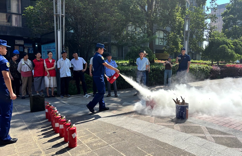 消防實操演示環(huán)節(jié),消防員現(xiàn)場示范滅火器、消防水帶等消防器材的正確使用方法,邀請并指導多位居民親身實踐。