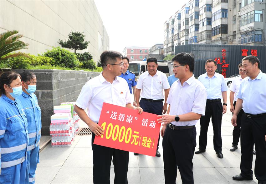 “桐城爭創(chuàng)衛(wèi)生城市離不開你們的奉獻,你們辛苦了。”徐雄一行首先來到市民廣場、文昌大道,慰問現(xiàn)場作業(yè)的環(huán)衛(wèi)工人和執(zhí)勤交警,感謝他們?yōu)橥┏亲鞒龅呢暙I。徐雄叮囑大家:“在高溫環(huán)境下工作時,要落實好安全防護和防暑降溫措施,以良好的身心健康狀態(tài)維持旺盛的工作精力。”