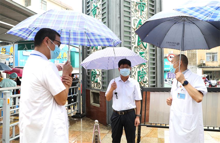 在市人民醫(yī)院核酸檢測點(diǎn),前來檢測的市民在雨中打傘排起了長隊(duì)?吹竭@一情況后,徐雄叮囑相關(guān)負(fù)責(zé)人,要切實(shí)增強(qiáng)“為民服務(wù)”意識,采取人性化措施,為市民提供便利,同時要嚴(yán)格落實(shí)“一米線、戴口罩”等要求,避免產(chǎn)生防控風(fēng)險。