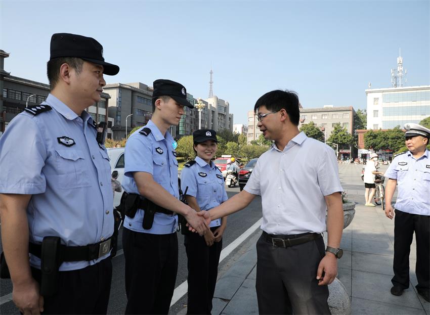 當(dāng)日上午,國(guó)慶文藝演出在市民廣場(chǎng)舉行,精彩的節(jié)目吸引眾多市民駐足觀看,但廣場(chǎng)周邊道路安全暢通,一派熱鬧、祥和、有序的景象。“感謝你們的堅(jiān)守,你們辛苦了!”徐雄與在此處執(zhí)勤的全體特警、民警、交警一一握手、問(wèn)候,對(duì)他們飽滿(mǎn)的工作熱情和良好的精神狀態(tài)給予充分肯定,并送上美好祝福。徐雄希望大家牢記職責(zé)使命、堅(jiān)守工作崗位,履職盡責(zé)、擔(dān)當(dāng)作為,切實(shí)維護(hù)好社會(huì)治安、交通秩序,用人民警察的辛苦指數(shù)換取群眾的幸福指數(shù)、歡樂(lè)指數(shù)。