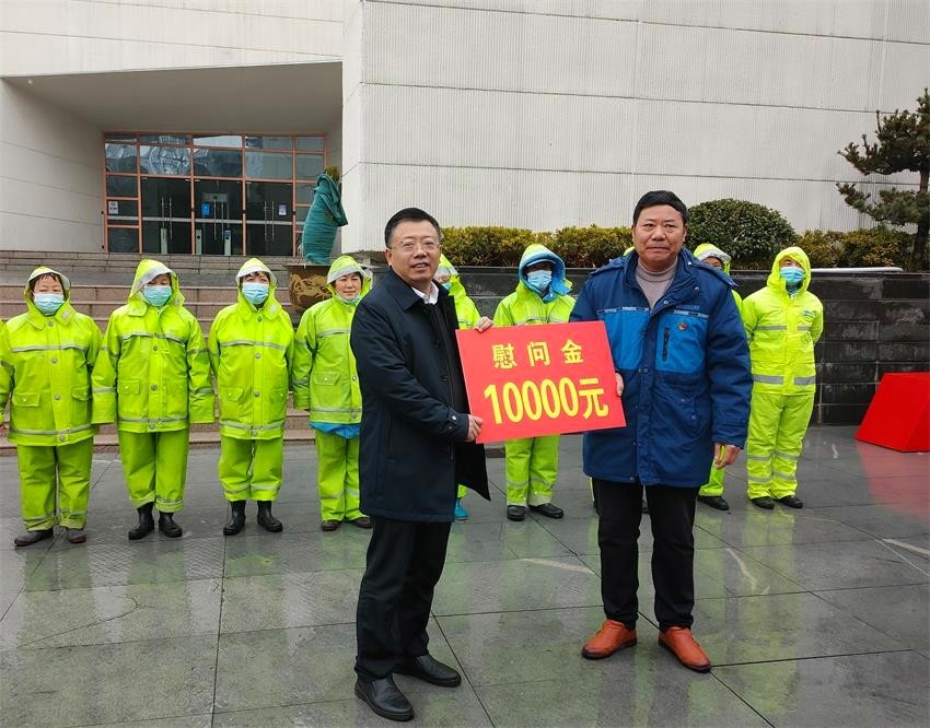 “大家辛苦了,春節(jié)臨近,我代表市委、市政府來看望大家,提前給你們拜個(gè)早年。”章周中一行首先來到市民廣場,慰問頂風(fēng)冒雨、堅(jiān)守一線的環(huán)衛(wèi)工人,與大家一一握手交談,感謝他們在提升城市品質(zhì)和文明創(chuàng)建中作出的積極貢獻(xiàn),并為他們送上慰問金。章周中強(qiáng)調(diào),環(huán)衛(wèi)工人是城市的“美容師”,他們不畏寒暑、不分晝夜,用辛勞汗水換取城鄉(xiāng)生活環(huán)境的干凈整潔,應(yīng)當(dāng)受到全社會的尊敬。希望大家做好防寒保暖措施,恪盡職守,為創(chuàng)造整潔美觀的市容市貌再作貢獻(xiàn);有關(guān)方面要關(guān)心關(guān)愛環(huán)衛(wèi)工人,用心用情改善他們的工作和生活條件,讓他們舒心安心工作。