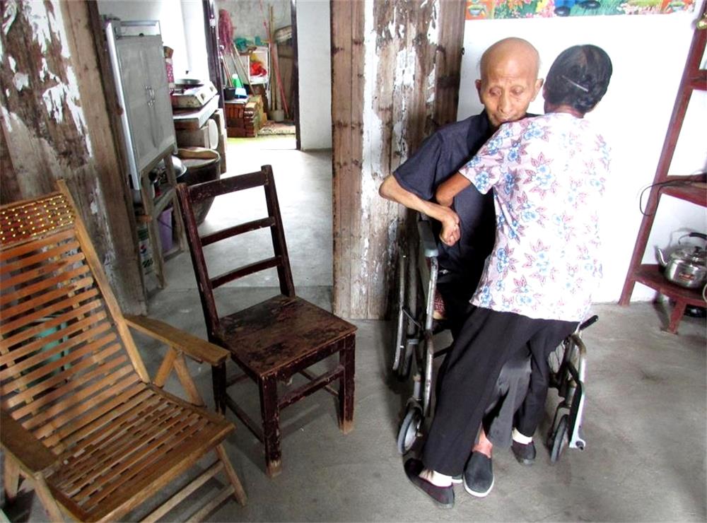 圖為方愛華扶助汪國應(yīng)坐輪椅。