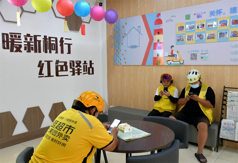 吳達(dá)明歇腳的這個(gè)“紅色驛站”設(shè)在市市場(chǎng)監(jiān)管局一樓大廳,墻上“暖新桐行 紅色驛站”極為醒目,驛站面積約25平方米,桌椅板凳、飲水機(jī)、電視機(jī)、空調(diào)、微波爐、手機(jī)充電、無(wú)線上網(wǎng)等設(shè)備一應(yīng)俱全,并建立了“紅色驛站讀書服務(wù)點(diǎn)”,上架圖書定期輪換、上新。像這樣為新業(yè)態(tài)戶外勞動(dòng)者提供放松解壓、讀書、茶水供應(yīng)、食物加熱等“一站式”服務(wù)的“紅色驛站”,市區(qū)有35個(gè),建成了“暖新桐行·新業(yè)態(tài)新就業(yè)群體黨群服務(wù)矩陣”,在主城區(qū)為新業(yè)態(tài)就業(yè)群體提供了“8分鐘服務(wù)圈”。