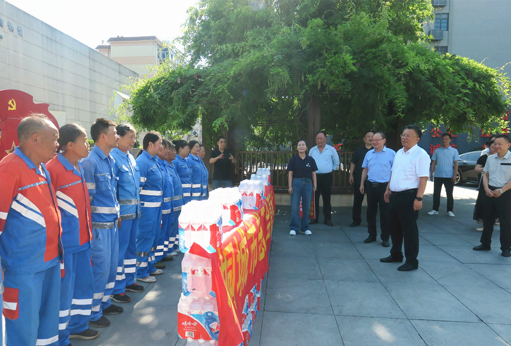 “時已三伏,酷熱逼人。在工作環(huán)境變得險惡、衛(wèi)生保潔任務加大的情況下,大家一直堅守崗位,保持市容整潔靚麗,你們辛苦了!”在市民廣場,章周中為一線環(huán)衛(wèi)工人代表送上礦泉水、秋石丹等防暑降溫物品與慰問金,并與大家親切交談,感謝大家為桐城美好形象、人民美好生活付出的辛勤勞動,希望大家注重勞逸結(jié)合、合理安排作息、保重身體健康,以更加飽滿的精神狀態(tài)投入環(huán)衛(wèi)保潔工作。