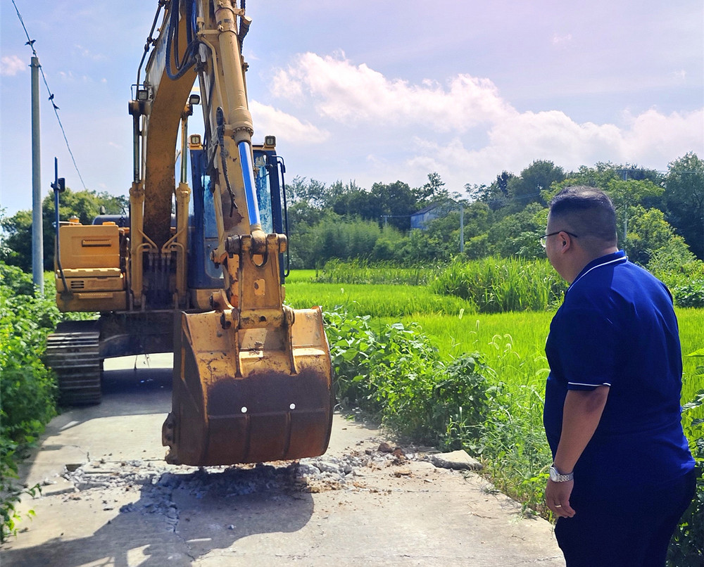 7月25日,新渡鎮(zhèn)勝圩村村民胡濤駕駛挖掘機(jī),免費(fèi)整修李板組破損的村組道路。