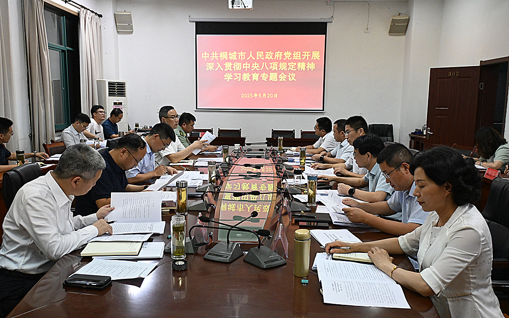 圖為市政府黨組開展深入貫徹中央八項規(guī)定精神學習教育專題會議現(xiàn)場。