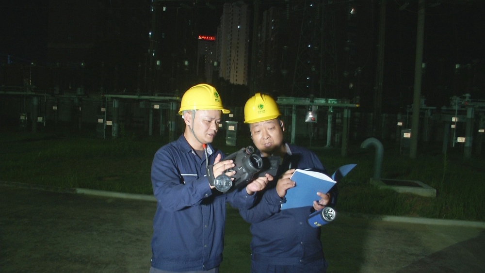 圖為電力人員夜巡測溫工作現(xiàn)場。