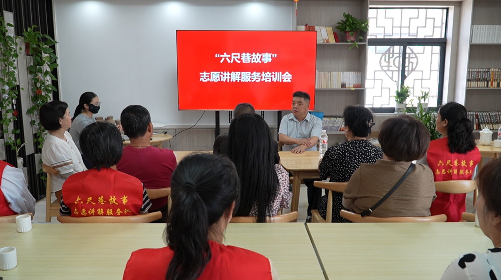 當(dāng)記者見到該項(xiàng)目負(fù)責(zé)人張?jiān)艜r(shí),他正站在六尺巷・德鄰社的講臺(tái)上,為20余名居民開展志愿講解培訓(xùn),臺(tái)下學(xué)員認(rèn)真記錄著講解技巧,一場“以老帶新”的傳承課堂正生動(dòng)上演。