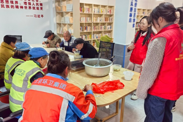 活動(dòng)當(dāng)天,青年志愿者們提前備料、布置場地,居民們自發(fā)加入包餃子隊(duì)伍,搟皮、填餡、捏褶一氣呵成,不一會(huì)兒,飽滿的餃子擺滿托盤。餃子下鍋煮好后,青年志愿者將盛好的餃子遞到剛送完單的騎手手中,站內(nèi)“暖新驛站”同步開放,提供歇腳、充電、熱水服務(wù),現(xiàn)場還準(zhǔn)備了護(hù)手霜、一次性雨衣等實(shí)用物資。