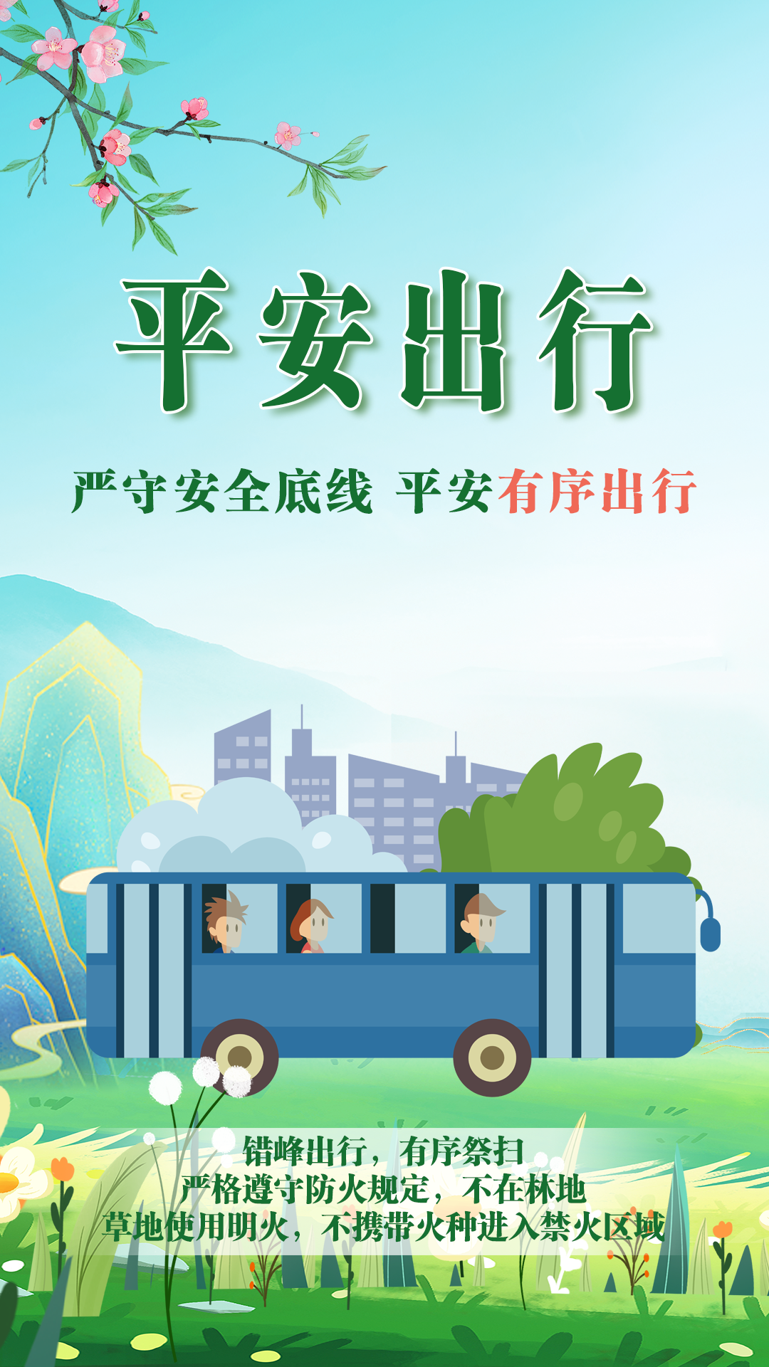 三、安全出行,分散祭掃。清明期間,出行祭祀人員和車輛較為集中,科學(xué)合理安排祭祀時(shí)間和出行方式,盡量錯(cuò)峰出行,避開祭掃高峰,盡可能選擇公共交通工具,減少交通擁堵。以安全有序的祭掃行為,守護(hù)綠水青山與萬(wàn)家安寧。